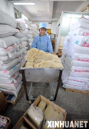10月19日,會昌縣五豐食品有限公司的職工在搬運米粉。 江西省會昌縣是著名的中國米粉之鄉,近年來,會昌縣依托科技創新,積極開發新產品,已從單一的直條米粉,發展到中式、營養、便捷、西式4個系列60多個品種。2008年1月至7月,該縣共出口米粉8200多噸,占生產總量的八成,產品遠銷美國、加拿大、英國、法國等30多個國家和地區。 新華社發(周科 攝)