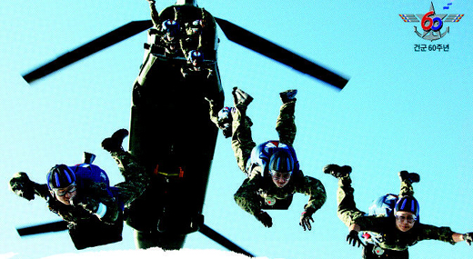 在忠清南道雞龍市一帶舉行的陸軍節(jié)活動中,游客們紛紛駐足仰望天空。天空中形形色色的降落傘不斷降落,正確地降落在同一個地點。為了向國民展示陸軍的強大軍容,作為陸軍節(jié)活動的一個環(huán)節(jié),這里正在舉行第32屆特戰(zhàn)司令官杯高空跳傘大賽。