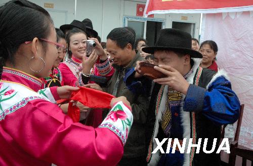 10月29日,新街社區居民在北川縣曲山鎮永興板房區聯歡。 當日是羌歷新年,在四川省北川,羌族群眾身著節日盛裝,度過震后第一個羌歷新年。 新華社記者 白瀛 攝