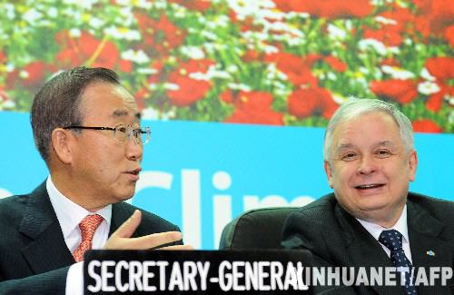 2008年12月11日 聯(lián)合國(guó)氣候變化大會(huì)高級(jí)別會(huì)議開(kāi)幕 12月11日,在波蘭波茲南,聯(lián)合國(guó)秘書(shū)長(zhǎng)潘基文(左)在聯(lián)合國(guó)氣候變化大會(huì)上與波蘭總統(tǒng)萊赫·卡欽斯基交談。當(dāng)日,聯(lián)合國(guó)氣候變化大會(huì)高級(jí)別會(huì)議在波蘭歷史名城波茲南開(kāi)幕,各方將為明年年底在丹麥哥本哈根就2012年后應(yīng)對(duì)氣候變化達(dá)成新協(xié)議而努力準(zhǔn)備。 新華社/法新