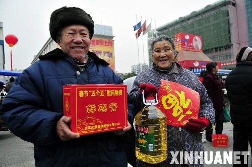 1月12日,湖北宜昌困難群眾領到了由政府發放的春節慰問物資。當日,湖北省宜昌市“5個5”(50斤大米、5斤油、5斤肉、5斤魚、5斤蛋)春節慰問物資發放工作啟動,全市將有25萬余名困難群眾領到這份“春節大禮包”。新華社發(黃翔 攝)