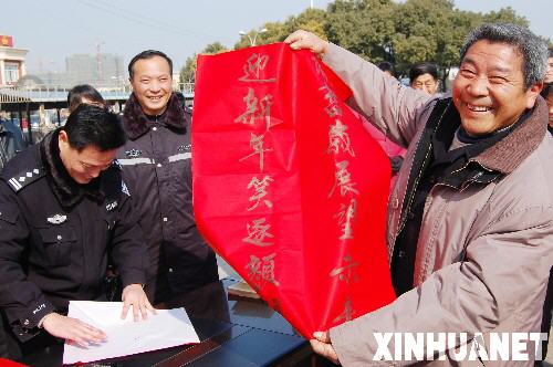 1月11日,一名返鄉農民工展示蕪湖交警贈送的春聯。當日是全國春運啟動第一天,安徽省蕪湖市交警支隊組織交警書畫愛好者來到蕪湖汽車站,為返鄉乘客義務書寫春聯、“福”字門貼,送去平安祝福。新華社發