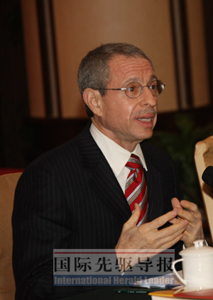 2008年12月22日 美國(guó)作家羅伯特·勞倫斯·庫(kù)恩的《中國(guó)30年:人類社會(huì)的一次偉大變遷》新書(shū)出版座談會(huì)在北京舉行。這是庫(kù)恩在座談會(huì)上發(fā)言。 本報(bào)記者 汪永基/攝
