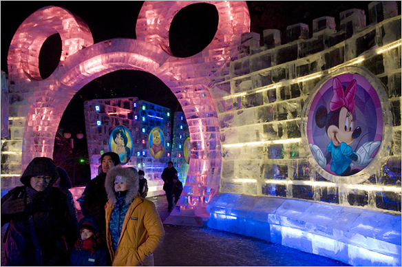 中國哈爾濱——幾十年來,這個西伯利亞南部嚴寒之地的冰雪節是中國最受歡迎的冬季旅游項目。哈爾濱冰雕的造型取材于最有代表性的中國建筑:長城、紫禁城、神圣的佛教名山。直到今年冬天,他們迎來了米老鼠、唐老鴨、維尼熊。