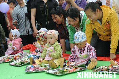 2009年5月13日 108個地震“羅漢娃”舉行生日抓周會 5月13日,地震“羅漢娃”正在抓周。 2008年5月12日,汶川大地震發(fā)生后,四川省什邡市婦幼保健院被震成危房,相鄰的千年古剎羅漢寺當天收留了將要臨產的全部孕婦。羅漢寺內,禪床變產床,廚房成產房,從5月13日清晨到8月7日什邡市婦幼保健院板房區(qū)建好的兩個多月里,羅漢寺內先后誕生了108個孩子,他們被人們親切地稱為“羅漢娃”。2009年5月13日,在什邡市剛剛落成的由北京援建的北京小學操場上,108個“羅漢娃”舉行了集體生日抓周活動。許多愛心人士不遠千里來到現場,與寶寶們結對,拜認干爹干媽。