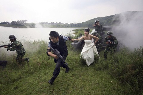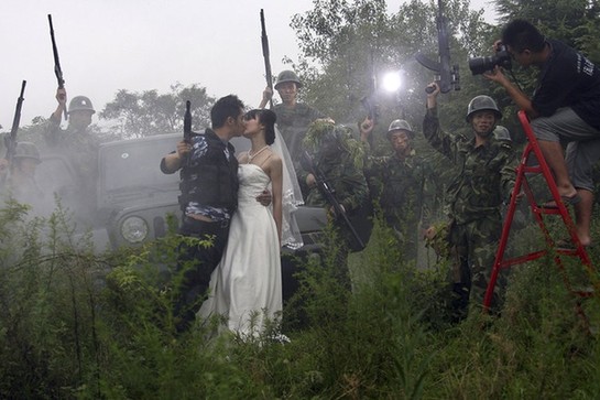 參加南京新婚夫妻陳河與馮潔今(音譯)婚禮的客人們感覺自己身處戰(zhàn)場。這對戀人在“戰(zhàn)火硝煙”中向?qū)Ψ皆S諾下終身。兩個新人在以前就一直就是軍事發(fā)燒友,他們就是在BB彈射擊運動場結(jié)識的。