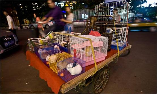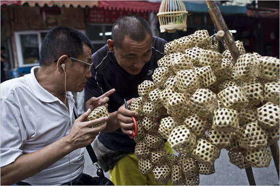 李海侖住的村子大約離北京有兩小時車程,大部分當(dāng)?shù)卮迕穸紡氖逻@一行:女的編籠子,男孩兒捉蛐蛐,男人們則騎車向城里的人兜售這些蛐蛐。除了偶爾的罰款,李每周能掙200美元,這對于忙于耕作的農(nóng)民來說是筆不小的收入。無論他走到哪里,蛐蛐的叫聲都能吸引一大群人!百u蛐蛐兒的人一到,你就知道夏天來了,”一個打算買蛐蛐的人說。