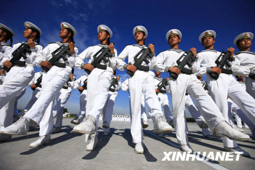 海軍水兵方隊在烈日下進(jìn)行嚴(yán)格訓(xùn)練(9月13日攝)。新中國成立60周年國慶閱兵式即將來臨,練兵場上的受閱官兵們精神飽滿、氣勢昂揚,他們在訓(xùn)練中精雕細(xì)刻,科學(xué)訓(xùn)練,決心以最嚴(yán)整的軍姿接受檢閱。新華社記者查春明攝