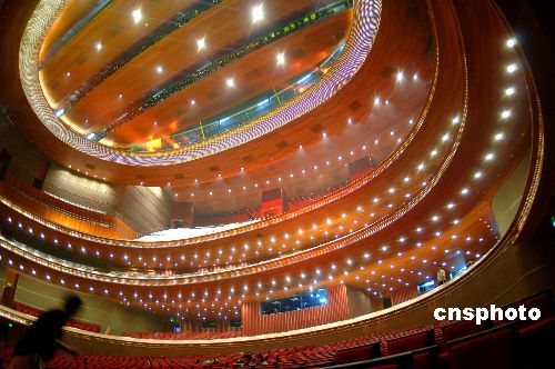 據鄧一江介紹,歌劇院是國家大劇院內最宏偉的建筑,以華麗的金色為主色調。席位數二千三百九十八個。歌劇院在墻面上安裝了弧形的金屬網,聲音可以透過去,而金屬網后面的墻是多邊形,這樣就做到了視覺的弧形,聽覺空間的多邊形,做到了建筑聲學和劇場美學的完美結合,使得混響時間達到了一點六秒的極佳效果。
