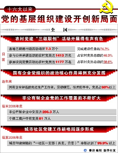 黨的十六大以來,在以胡錦濤同志為總書記的黨中央的堅強領導下,各級黨組織以鄧小平理論和“三個代表”重要思想為指導,深入貫徹落實科學發展觀,加強黨的執政能力建設和先進性建設,繼續推進黨的建設新的偉大工程,以改革的精神加強和改進黨員隊伍建設和黨的基層組織建設,黨員隊伍結構不斷得到改善,分布更趨合理,使我們黨始終充滿創造力、凝聚力、戰斗力,始終成為團結帶領各族人民建設中國特色社會主義的堅強領導核心。