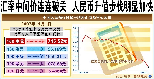 11月7日,中國(guó)外匯交易中心公布,人民幣對(duì)美元匯率中間價(jià)突破7.45關(guān)口,以7.4476再創(chuàng)匯改以來(lái)的新高,單日升值幅度達(dá)到101個(gè)基點(diǎn),這是今年以來(lái)人民幣匯率第68次創(chuàng)新高。按照匯改時(shí)8.11的匯率計(jì)算,匯改以來(lái)人民幣累計(jì)升值幅度已達(dá)到8.18%。