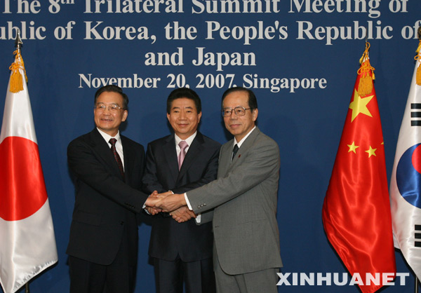 新華網(wǎng)新加坡11月20日電(記者 許鉞乃 胡曉明) 第八次中國(guó)、日本、韓國(guó)領(lǐng)導(dǎo)人會(huì)議20日在新加坡舉行。中國(guó)國(guó)務(wù)院總理溫家寶、日本首相福田康夫和韓國(guó)總統(tǒng)盧武鉉 出席會(huì)議。盧武鉉主持會(huì)議。三國(guó)領(lǐng)導(dǎo)人對(duì)一年來三國(guó)合作的進(jìn)展表示滿意,確定了今后的合作項(xiàng)目,并就共同關(guān)心的國(guó)際和地區(qū)問題交換了意見。