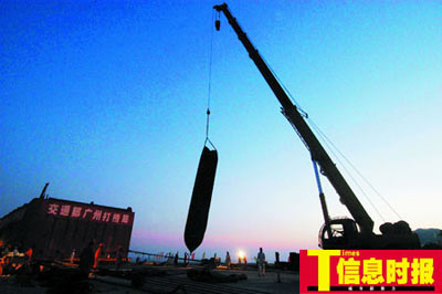 昨日凌晨零時,南海I號沉箱在登陸。本版攝影 時報特派記者 何 建