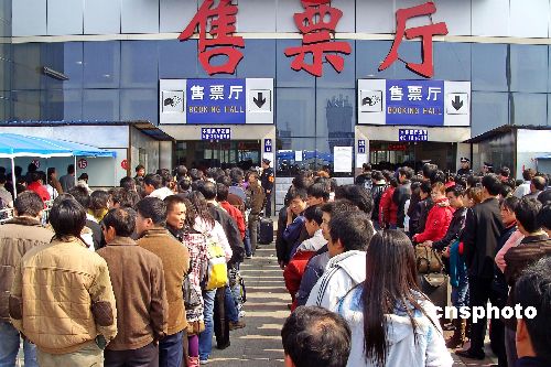 為確保廣大農(nóng)民工春節(jié)前平安順利返鄉(xiāng)和節(jié)后及時(shí)安全返城,二00八年春運(yùn)中國鐵路將首次辦理農(nóng)民工往返火車票。資料圖為2007年春運(yùn)時(shí),旅客在售票廳外排起長(zhǎng)龍。 中新社發(fā) 劉君鳳 攝
