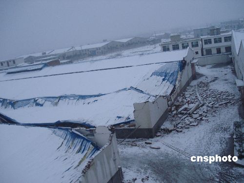 1月19日,由于連降暴雪,安徽合肥瑤海區工業園5000多平方米倉庫廠房被積雪壓塌,所幸沒有造成人員傷亡。據悉,該工業園已免費提供2萬平方米標準倉庫,在確保安全的情況下,預計1月20日組織拆遷隊伍扒開屋頂,推倒墻壁,把被埋物資全部轉移。 中新社發 何保豐 攝