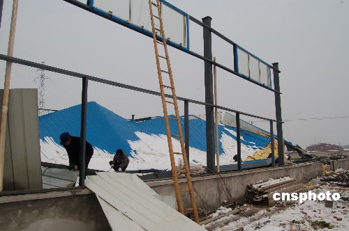 1月23日,安徽含山宏記精工鑄件廠的工人正在清理被大雪壓垮的廠房。從1月14日開始,安徽含山境內普降中到大雪。據不完全統計,該縣受災人口達6800人,農作物受災面積800公頃,居民和企業倒塌或損壞的房屋200多間,直接經濟損失超過1000萬元。目前該縣正組織多部門開展自救。 中新社發 田斌峰 攝