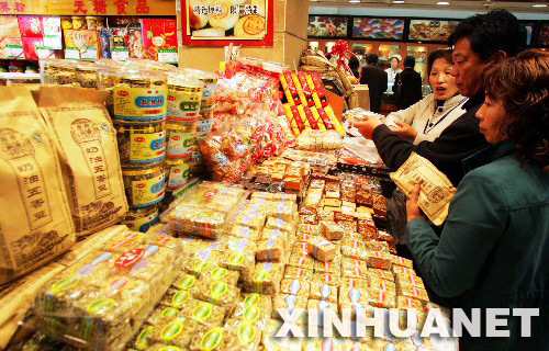 2007年11月13日,消費(fèi)者在上海南京路上的一家食品商店內(nèi)選購商品。 新華社記者 裴鑫 攝