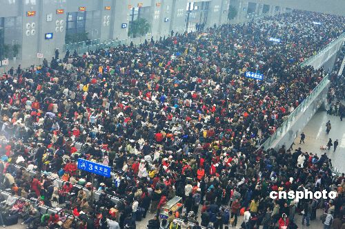 2008年1月27日下午,武昌火車站候車室內擠滿了等待乘車的旅客。當日,受雨雪天氣影響,廣鐵集團湖南境內京廣線供電接觸網(wǎng)多處斷電,電力機車無法通行,致使旅客列車出現(xiàn)多列晚點。武昌火車站采取措施,在新落成的候車室內開通暖氣,確保滯留旅客不受凍。 中新社發(fā) 宋建春 攝