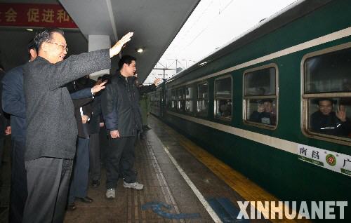1月30日,中共中央政治局常委、國務院總理溫家寶在廣州火車站看望旅客。這是溫家寶總理在站臺上為一列發往武昌的旅客列車送行。這列火車是從南昌緊急調來支援廣州車站的。 新華社記者姚大偉攝