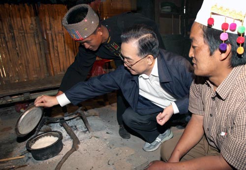 在丁孔洪的家里,溫家寶詳細地詢問了景頗族村民的生產生活情況。他還走進簡陋的廚房,蹲下身子揭開鍋蓋看一看伙食;來到破舊的臥室,仰頭望一望屋頂是否破漏。