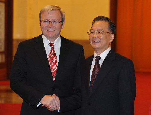 4月10日,中國(guó)國(guó)務(wù)院總理溫家寶在北京人民大會(huì)堂與澳大利亞總理陸克文舉行會(huì)談。 新華社記者黃敬文攝