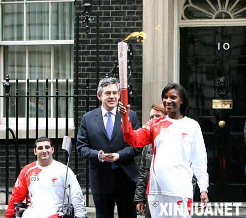 4月6日,在首相府前,第34棒火炬手、英國(guó)田徑名將丹尼斯·劉易斯(右一)展示火炬。英國(guó)首相布朗(左二)、第35棒火炬手阿里·賈瓦德(左一)等一同觀看。當(dāng)日,北京奧運(yùn)會(huì)圣火傳遞活動(dòng)在英國(guó)倫敦舉行,這是北京奧運(yùn)會(huì)圣火境外傳遞的第四站。 新華社記者謝秀棟攝