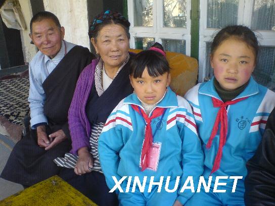 資料圖片:4月16日,次仁德吉(左二)、丈夫益西旺杰(左一)和兩個外孫女在一起。家住拉薩市城關區藏熱鄉加榮村的74歲藏族老阿媽次仁德吉在拉薩“3·14”嚴重暴力事件中,勇敢地救助了3名漢族群眾,在危難時刻體現出了藏漢團結的民族之情。次仁德吉說:“藏漢就是一家人!我不能見死不救!”新華社記者 劉錚攝