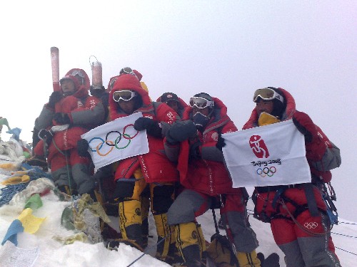 2008年5月8日,北京奧運(yùn)圣火珠峰傳遞登山隊(duì)成功登頂珠峰。這是登山隊(duì)員在峰頂展示“祥云”火炬、火種燈、奧運(yùn)五環(huán)旗和北京奧運(yùn)會(huì)會(huì)徽旗。圣火在珠峰頂上燃燒,實(shí)現(xiàn)了中國(guó)向國(guó)際奧委會(huì)、向各國(guó)人民的莊嚴(yán)承諾。新華社特約記者 阿旺扎西 攝
