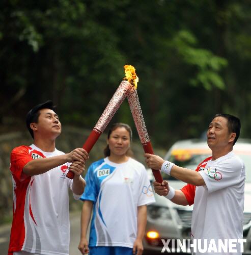 5月15日,奧運(yùn)火炬手陸榮明(右)與鄭海峰在傳遞過程中交接。當(dāng)日,北京奧運(yùn)會(huì)圣火傳遞活動(dòng)在江西井岡山舉行。 新華社記者邢廣利攝