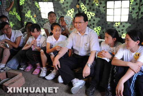李長春一直牽掛著北川中學學生的學習和生活情況。2日下午,他專程趕到設在長虹培訓中心的北川中學臨時學校,走進教室,看望在這里復課的學生。在這次特大地震中,北川中學有多名教師和學生臨危不懼、搶救同學,李長春對他們的英勇行為給予高度評價。他說,要運用多種形式,大力宣傳災區廣大教師和學生在抗震救災中的感人事跡,給人以信心和力量。曾經在中央電視臺《愛的奉獻》大型募捐活動中哭訴地震經歷的高三學生劉怡雪拉著李爺爺的手說,我在地震中失去了親人,但我得到了全社會那么多的關愛,今后我一定要堅強起來,不再哭了。李長春鼓勵劉怡雪和同學們盡快從悲痛中解脫出來,抓緊復習功課,以飽滿的狀態積極準備高考,力爭取得優異的成績。李長春還走進學生居住的帳篷,席地而坐,與幾名初一學生親切交談,仔細詢問每頂帳篷住幾個人、生活習慣不習慣。李長春說,原來的校舍雖然垮塌了,但困難只是暫時的,黨和政府一定會為你們建設一個更加堅固、更加漂亮的新學校。