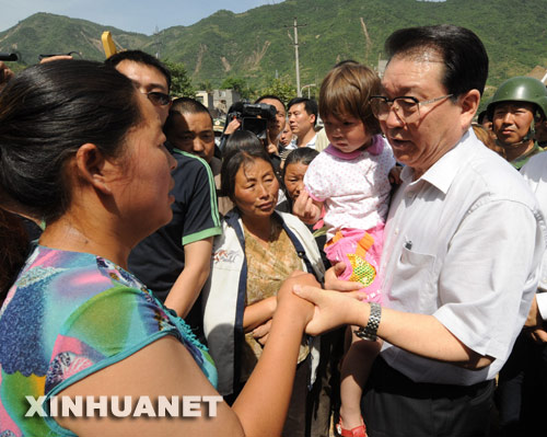 這是6月2日,李長春在平武縣南壩鎮察看災情,慰問災區干部群眾和救援人員,指導抗震救災工作。 新華社記者 李學仁 攝