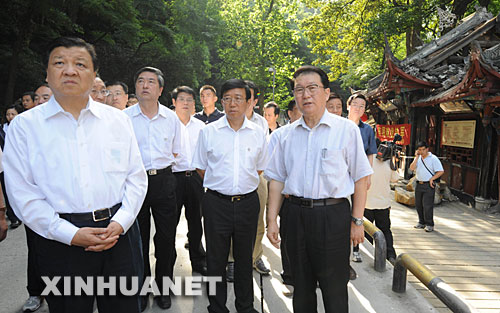 這是6月3日,李長春在都江堰察看在地震中受損嚴重的世界文化遺產都江堰二王廟。新華社記者李學仁攝