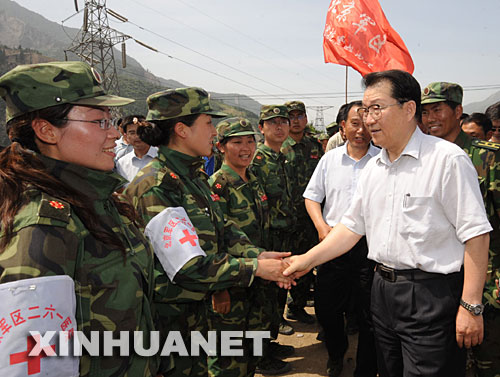 這是6月3日,李長春在四川汶川縣映秀鎮看望慰問來自北京軍區的醫務工作者。新華社記者李學仁攝