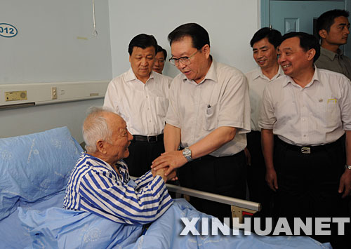 這是6月3日,李長春在四川成都華西醫院親切慰問正在接受治療的受傷群眾。新華社記者李學仁攝