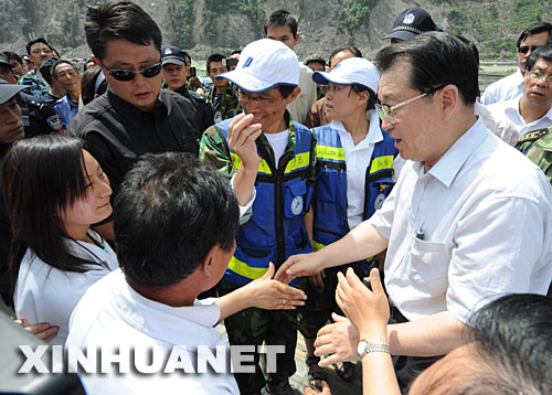 這是6月3日,李長春在四川汶川縣映秀鎮看望慰問來自廣東省和山東省的志愿者。新華社記者李學仁攝