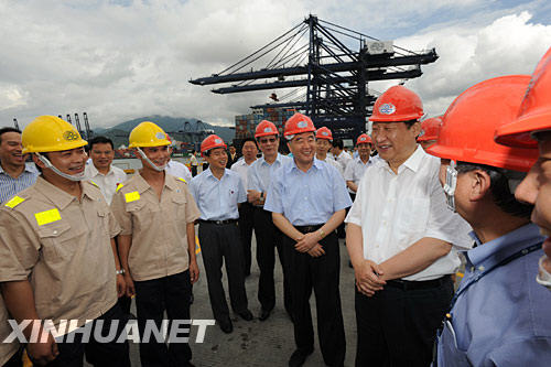 7月4日至5日,中共中央政治局常委、中央書記處書記、國家副主席習近平在廣東考察工作。這是7月5日,習近平在鹽田國際集裝箱碼頭看望現場工作人員。 新華社記者 黃敬文 攝