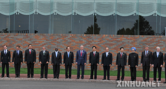 7月9日,國家主席胡錦濤在日本北海道洞爺湖出席八國集團同發展中國家等領導人對話會議。這是領導人集體合影。新華社記者 樊如鈞 攝