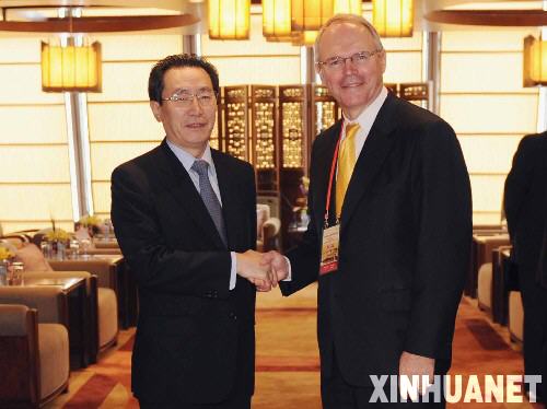 7月10日上午,朝核問題六方會談中方代表團團長、中國外交部副部長武大偉(左)在北京釣魚臺會見朝核問題六方會談美國代表團團長希爾。 新華社記者王建華攝