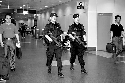 持槍武裝特警開始在首都機場各航站樓進行巡邏。資料圖片