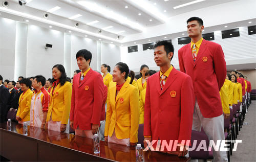7月25日,中國體育代表團成員姚明等在成立大會上。當(dāng)日,北京奧運會中國體育代表團在北京正式成立,總?cè)藬?shù)1099人,其中包括運動員639人。 新華社記者趙鵬攝