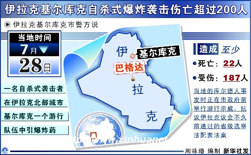 新華網(wǎng)巴格達(dá)7月28日電(記者惠曉霜 亢德喜)伊拉克基爾庫(kù)克市警方28日說(shuō),當(dāng)天發(fā)生在基爾庫(kù)克市的自殺式爆炸襲擊已經(jīng)造成22人死亡、187人受傷。