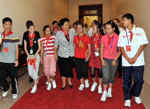 8月2日,中共中央政治局委員、國務委員劉延東在北京人民大會堂看望即將赴匈牙利、保加利亞療養的近100名四川汶川地震災區中小學生。 新華社記者 樊如鈞 攝