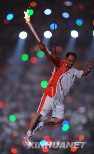 8月8日,第29屆夏季奧林匹克運動會在中國國家體育場隆重開幕。這是李寧高舉火炬凌空繞場一周,準備點燃主火炬塔。新華社記者郭大岳攝