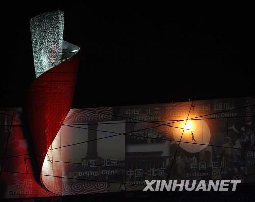 在“鳥巢”的中央,高舉火炬的李寧騰空而起,在體育場上空的“空中跑道”上奔跑起來。與此同時,一幅中國式畫卷沿“空中跑道”徐徐展開,“祥云”背景的畫卷上呈現出奧運圣火在各地傳遞的動態影像。畫卷完全展開之時,高高的火炬塔出現了。此時,全場屏息,一片寂靜。