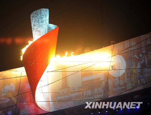 8月8日,第29屆夏季奧林匹克運動會在中國國家體育場隆重開幕。這是主火炬塔被點燃。新華社記者劉大偉攝