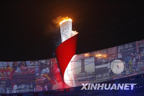 在空中奔跑的李寧來到主火炬塔旁,點燃引線。噴薄的火焰立即沿火炬塔盤旋而上,滾滾翻涌的奧運圣火,把體育場的上空映照得一片輝煌。全場為之沸騰,今夜無人入睡……