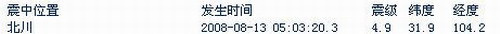 四川在線消息 據四川地震臺網測定,北京時間2008年08月13日05時03分在北川(北緯31.9,東經104.2) 發生4.9級地震,成都市區有震感明顯。