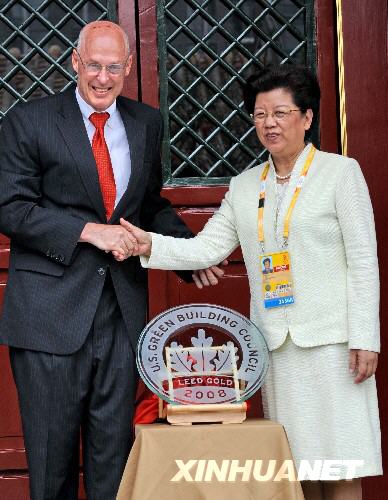 8月13日,全國人大常委會副委員長、北京奧組委副主席、北京奧運村村長陳至立和美國財政部長保爾森在頒獎儀式上。當日,美國財政部長保爾森來到北京奧運村,代表美國綠色建筑協會為北京奧運村頒發綠色環保金獎“能源與環境設計先鋒金獎”。 新華社記者張國俊攝