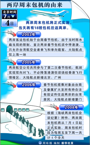 經(jīng)海協(xié)會與海基會協(xié)商,兩岸周末包機(jī)于2008年7月4日啟動。