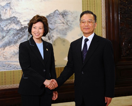 8月23日,中國(guó)國(guó)務(wù)院總理溫家寶在中南海紫光閣會(huì)見(jiàn)前來(lái)出席北京奧運(yùn)會(huì)閉幕式及相關(guān)活動(dòng)的美國(guó)總統(tǒng)代表團(tuán)團(tuán)長(zhǎng)、勞工部長(zhǎng)趙小蘭。新華社記者 李濤 攝